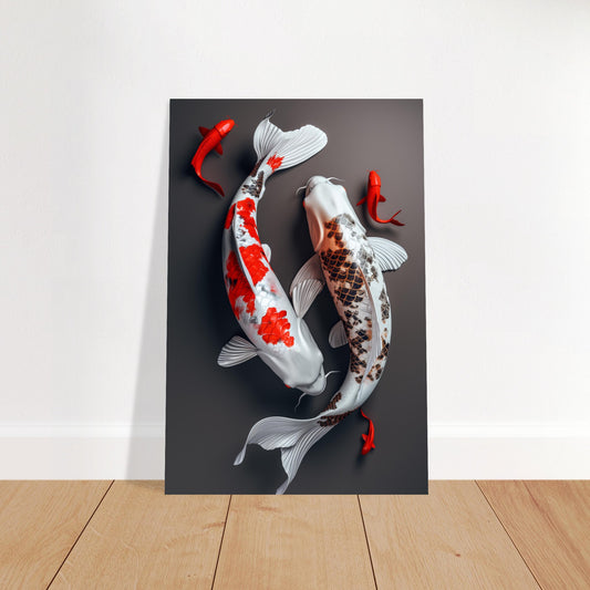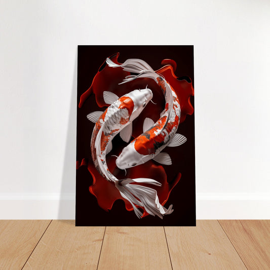 Yin und Yang - Koi-Tanz auf dunkelrotem Poster